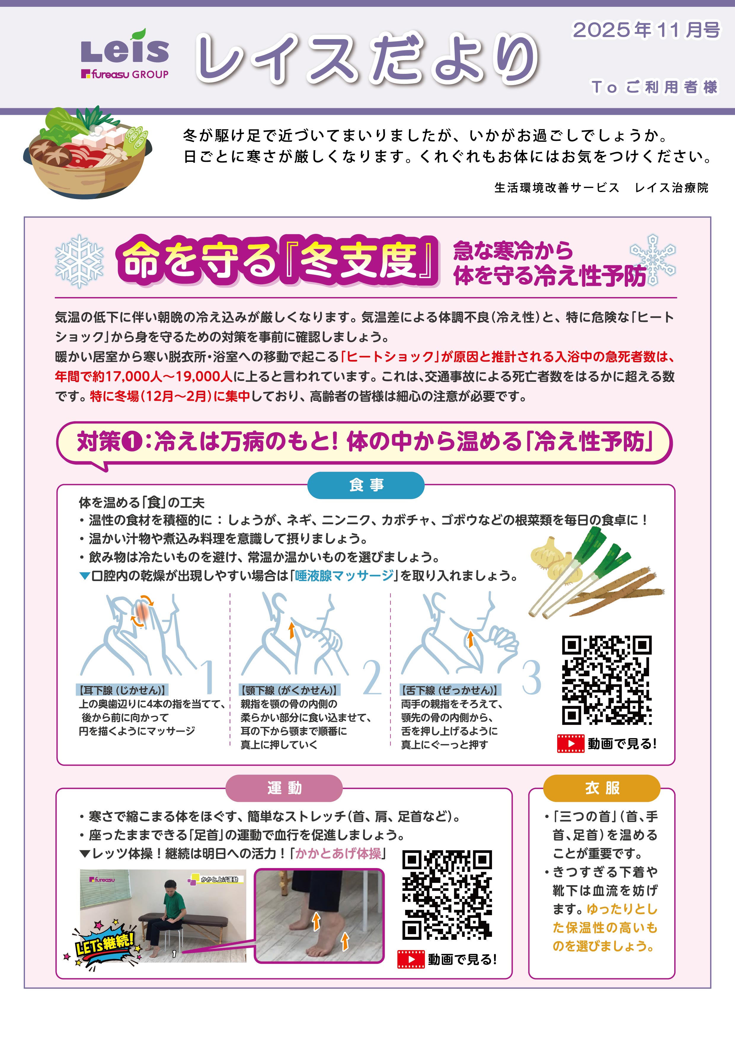 10月 27, 2025 レイスだより11月号をリリースいたしました! ( 上記画像をクリックするとPDFデータがダウンロードできます。 ) レイスだより11月号をリリースいたしました。 ぜひご覧ください。 レイスだより一覧へ 友だち追加 本部からのお知らせ一覧へ サイトトップへ