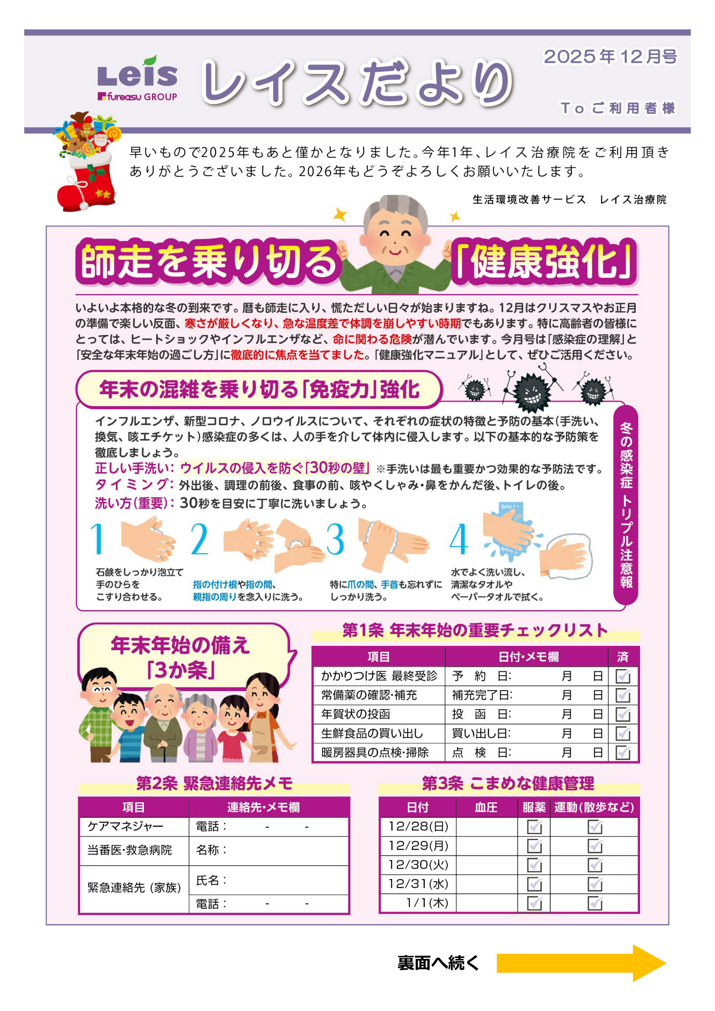 11月 25, 2025 レイスだより12月号をリリースいたしました! ( 上記画像をクリックするとPDFデータがダウンロードできます。 ) レイスだより12月号をリリースいたしました。 ぜひご覧ください。 レイスだより一覧へ 友だち追加 本部からのお知らせ一覧へ サイトトップへ